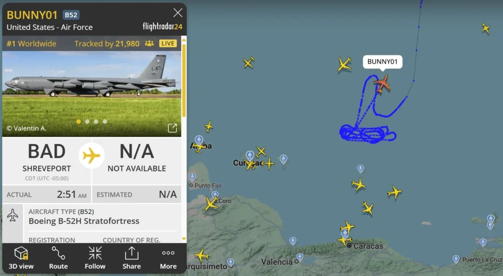 Registros de vuelo públicos mostraron el recorrido de los bombarderos sobre aguas internacionales, sin ingresar al espacio aéreo venezolano. Usuarios en redes sociales destacaron las maniobras, interpretadas por muchos como un mensaje directo a Caracas en un momento de alta tensión diplomática.